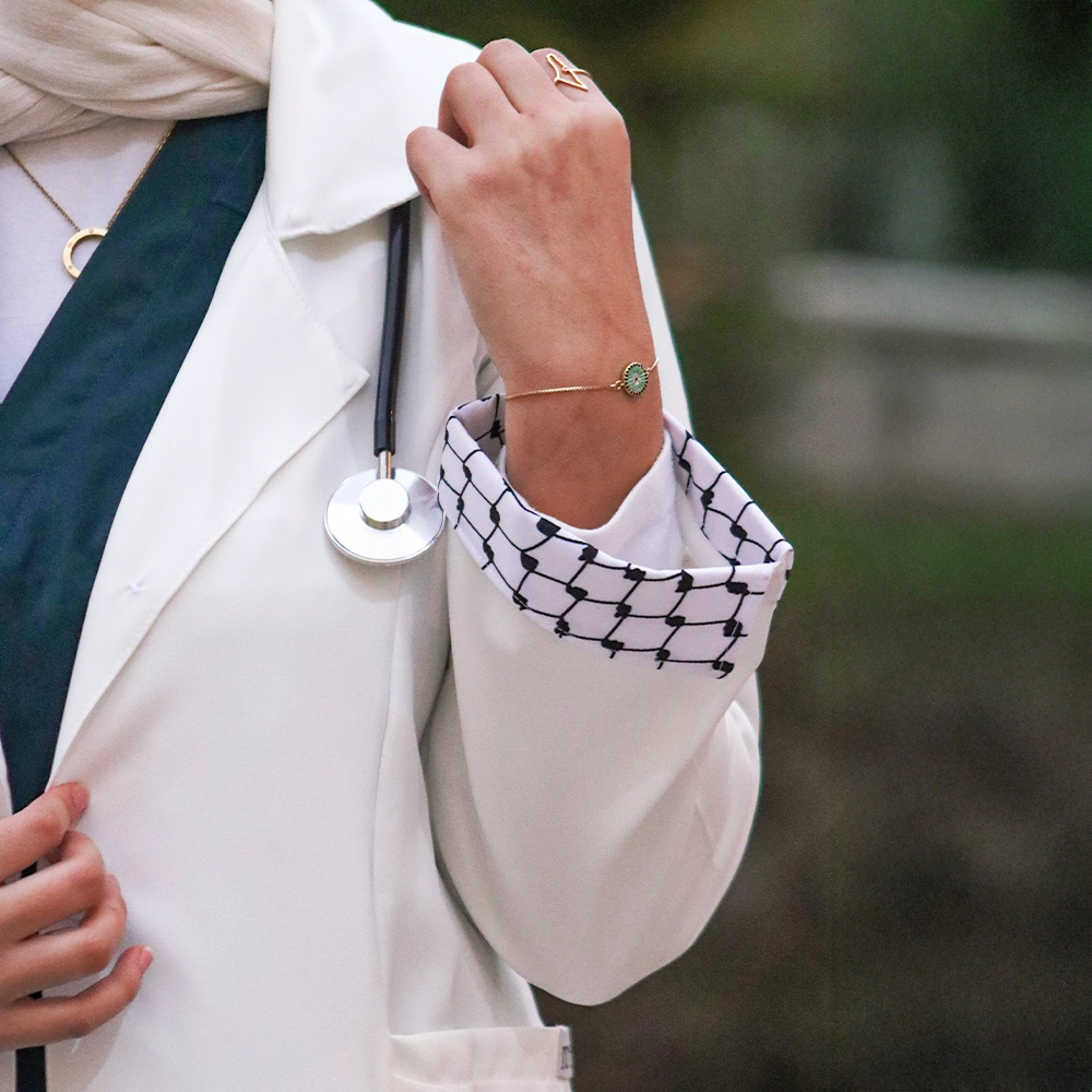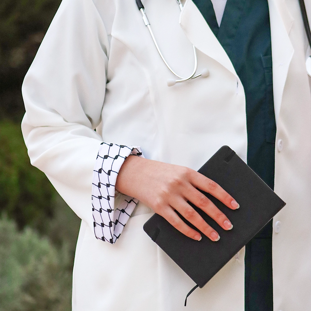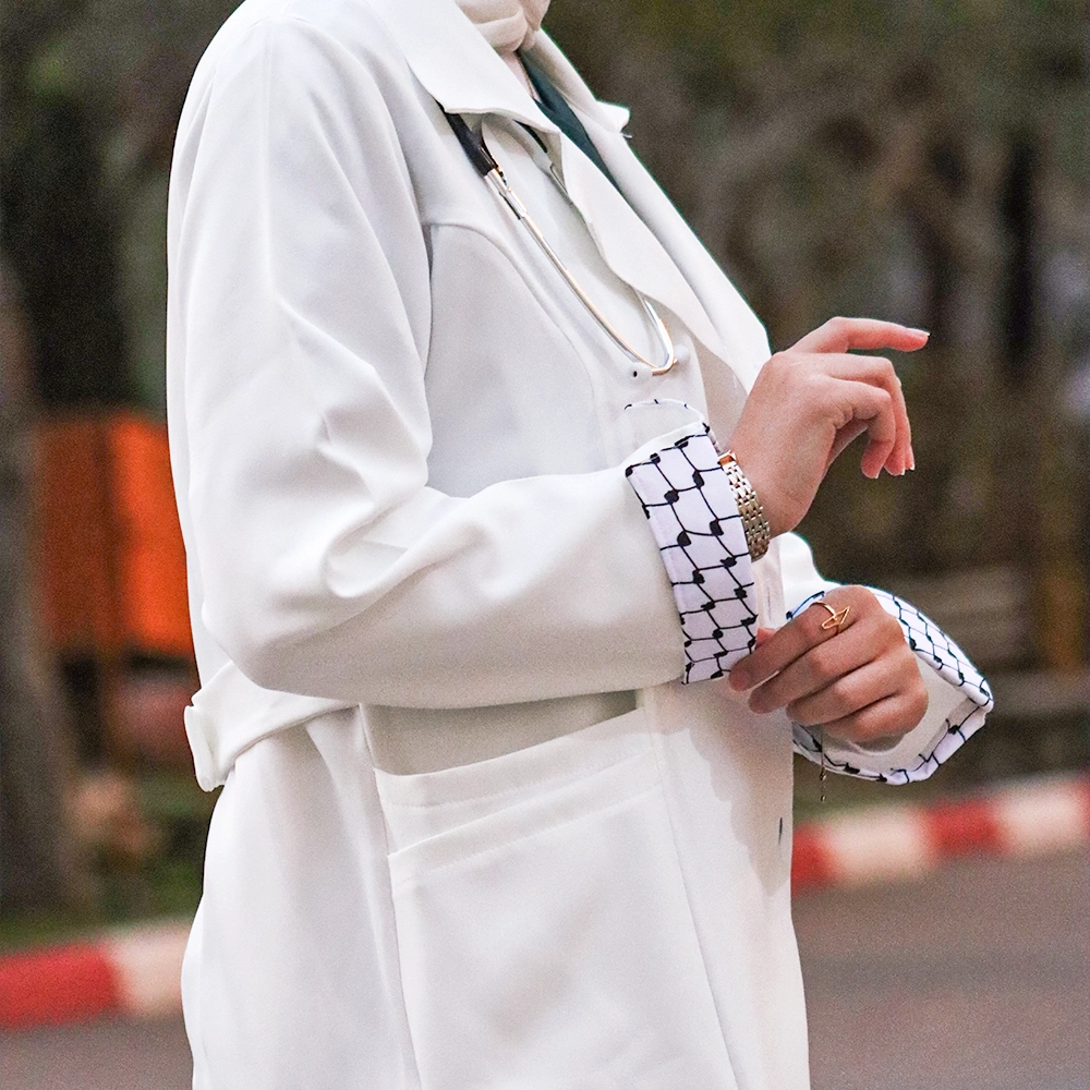 تصميم أبيض أنيق يتزيّن بتفاصيل الكوفية الفلسطينية ليجسّد الهوية بروح عصرية.